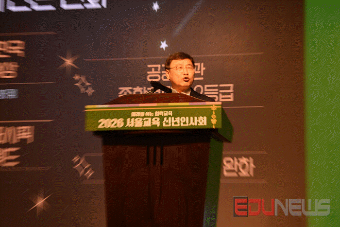[에듀뉴스] 서울특별시교육청(교육감 정근식)이 13일, 용산구 백범김구기념관 컨벤션홀에서 개최한 ‘2026년 서울교육 신년인사회’에서 정근식 교육감이 인사말을 하고 있다.