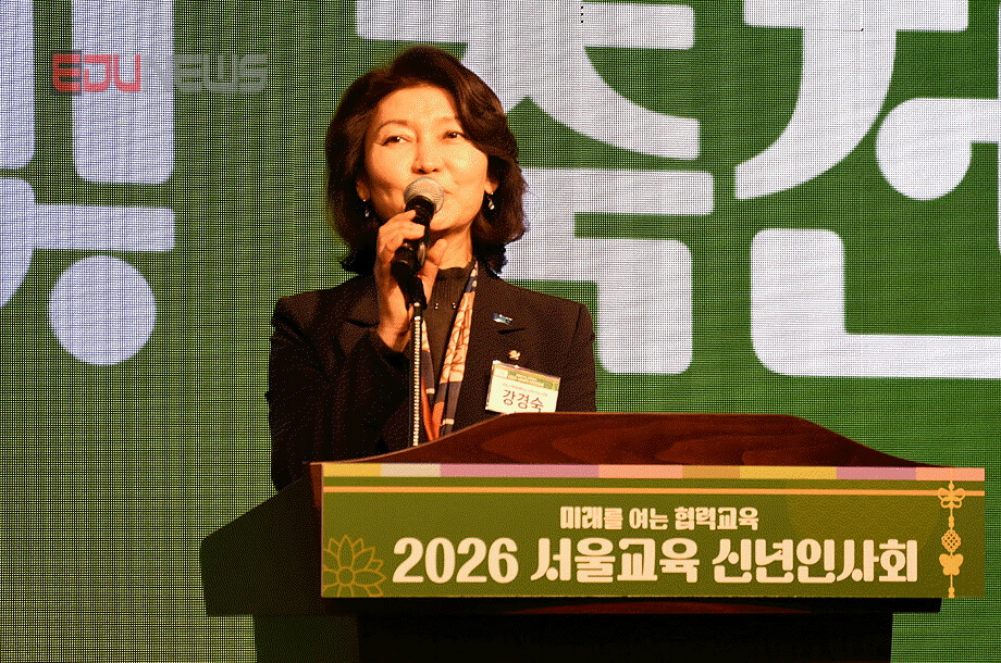 [에듀뉴스] 서울특별시교육청(교육감 정근식)이 13일, 용산구 백범김구기념관 컨벤션홀에서 개최한 ‘2026년 서울교육 신년인사회’에서 강경숙 조국혁신당 비례대표가 축사를 하고 있다.