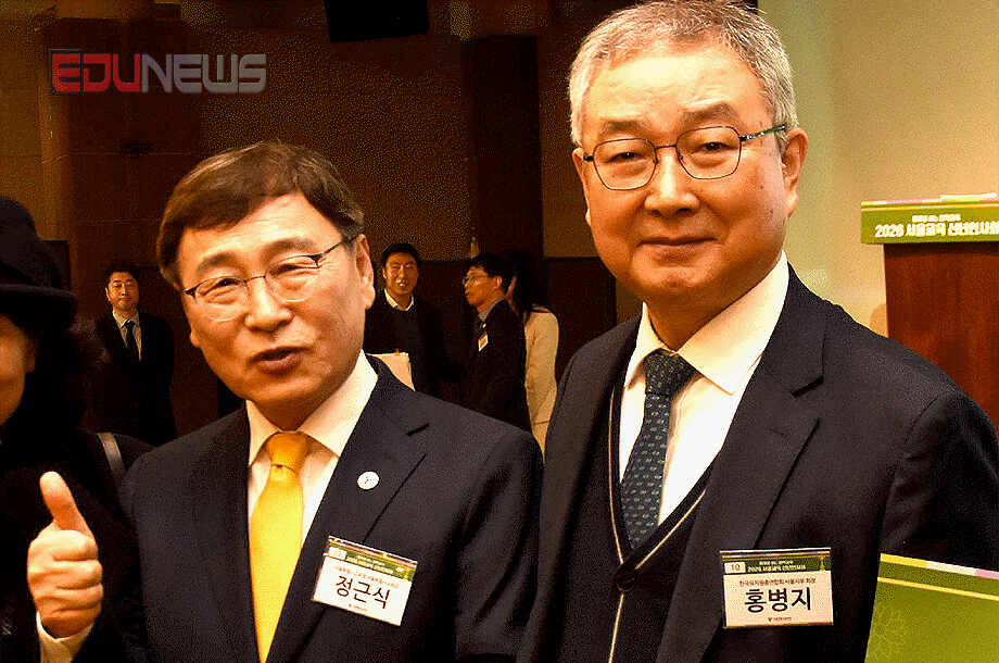 [에듀뉴스] 서울특별시교육청(교육감 정근식)이 13일, 용산구 백범김구기념관 컨벤션홀에서 개최한 ‘2026년 서울교육 신년인사회’에서 정근식 교육감이 지난 10년간 서울교육을 이끌었던 조희연 전 교육감을 이끌며 인사를 시키고 있으며 조 전 교육감은 ‘혁신정치(가제)’라는 책을 출판하기 위해 집필중이다.