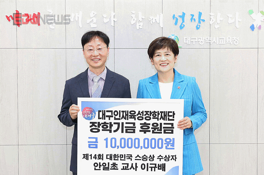 [에듀뉴스] 대구광역시교육청(교육감 강은희)은 3일, ‘제14회 대한민국 스승상’ 수상자인 대구안일초등학교 이규배 교사가 대구인재육성장학재단에 장학금 1천만원을 기탁했다고 밝혔다.