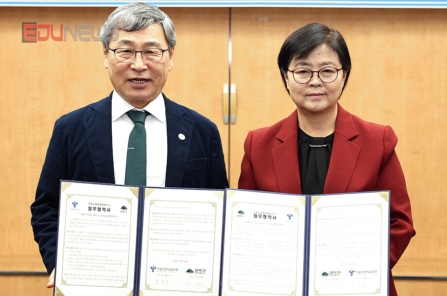[에듀뉴스] 정근식 서울특별시교육감과 이순희 강북구청장이 14일 오후 서울 강북구청에서 ‘강북교육협력특화지구’ 업무협약을 체결하고 있다. 이번 협약을 통해 성북강북교육지원청과 강북구는 지역의 교육 환경과 인프라를 기반으로 특색있는 교육프로그램을 공동으로 운영할 예정이다.