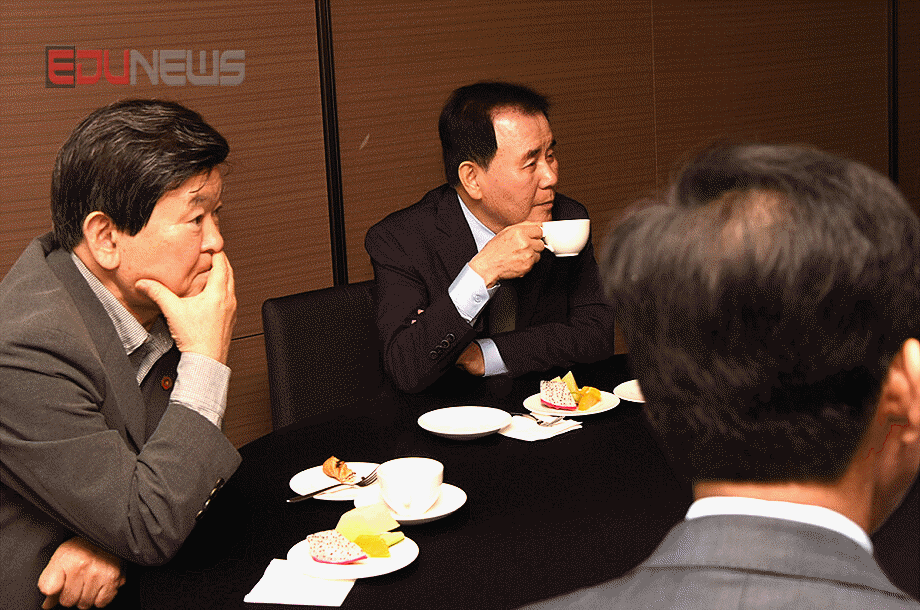 [에듀뉴스] 26일, 부산광역시 윈덤그랜드부산호텔에서 열린 대한민국교육감협의회(교육감협)가 개최되기에 앞서 교육감 들간 차담회에서 김석준 부산광역시 교육감과 강은희 대구광역시 교육감이 이날 차담회장에서 울리고 있는 트롯트에 대해 환담을 나누고 있다.
