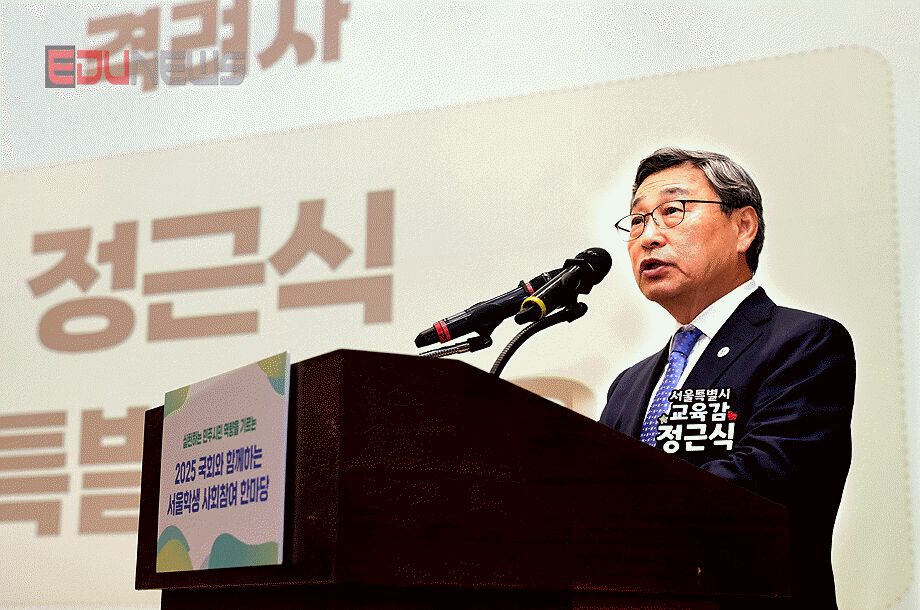 [에듀뉴스] 정근식 서울특별시교육감이 15일 오후 서울 영등포구 국회의원회관에서 열린 ‘국회와 함께하는 서울학생 사회참여 한마당’에 참석해 격려사하고 있으며 이번 행사는 중·고 학생들이 민주시민으로 성장할 수 있도록 사회 현안에 대한 이해와 실천적 참여를 도모하기 위해 마련됐다.