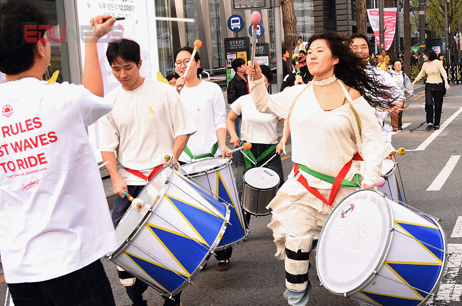 [에듀뉴스] 세월호 참사 12주기를 닷새 앞둔 11일 서울 중구 숭례문 인근에서 열린 4·16 세월호 참사 12주기 기억·약속 시민대회에서 레츠피스(‘공공(公共)하는 청년’ 소속의 평화 퍼포먼스팀. 청년과 청소년이 모여 퍼커션(타악기)을 치며 브라질 바투카다를 연주하는 한반도의 평화와 지구생명과의 상생을 꿈꾸는 단체)가 난타로 분위기를 고조시키고 있다.