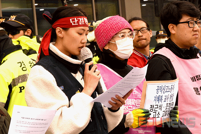 [에듀뉴스] 서울특별시교육청이 1일 오후 2시, 용산구 신청사 대강당에서 서울시교육청 신청사 개청식을 개최할 예정인 가운데 오전 11시 서울시교육청사 앞에서 성폭력사안·교과운영부조리공익제보교사 부당전보철회를 위한 공대위(공대위)가 기자회견을 열고 점거 농성에 돌입했다.