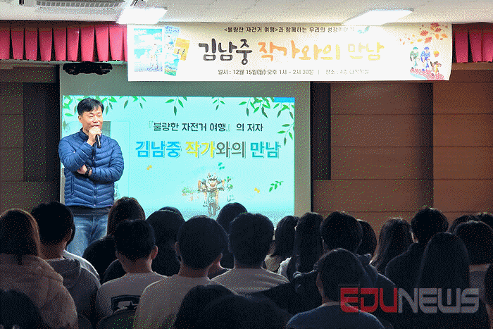 학교 관계자에 따르면 ‘불량한 자전거여행과 함께하는 우리의 성장이야기’라는 주제로 진행된 이번 강연에서 김 작가는 자신의 대표작 ‘불량한 자전거 여행’의 창작 과정과 이야기 주제와 관련된 경험, 작가가 되려면 해야하는 일 등에 대해 진솔한 이야기를 나눴다.