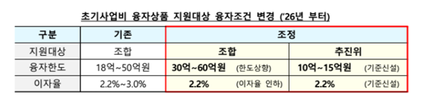 국토부는 사업 초기 자금 조달에 어려움을 겪는 각 조합에 사업비를 저리 융자하는 초기자금 융자 상품의 지원 대상에 추진위를 추가하고, 융자한도를 기존 18~50억 원에서 조합 30~60억 원ㆍ추진위 10~15억 원으로 상향 또는 신설한다. 이자율은 기존 2.2~3%에서 2.2%로 인하한다.