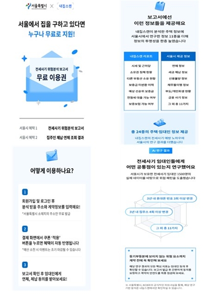 보고서는 `서울주거포털` 또는 `청년몽땅정보통`의 전세사기 위험분석 배너를 통해 민간 부동산 리스크 분석 플랫폼 `내집스캔`에 접속한 뒤, 시 쿠폰을 발급받아 이용할 수 있다. 서울 지역 임대차계약 예정자 1000명을 대상으로 무료 제공되며, 계약을 고려하고 있는 주택의 주소를 입력하면 AI가 수집ㆍ분석한 정보를 제공받을 수 있다.