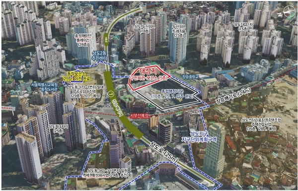 대상지는 동작구 상도동 176-1 일원 1만4025.5㎡ 규모로, 지하철 7호선과 서부선(예정)의 환승역세권에 위치한다.