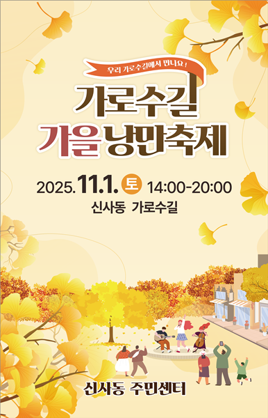 이태호 신사동장은 "가로수길 가을 낭만축제를 지역 주민과 상인ㆍ방문객이 함께 참여하는 은은하고 가을 감성 넘치는 지역축제로 만들겠다"며 "많은 분이 찾아오셔서 일상에 낭만을 더해주는 `작은 쉼표`를 발견하시길 바란다"고 말했다.