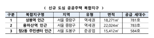 [아유경제=조명의 기자] 국토교통부(장관 김윤덕ㆍ이하 국토부)는 이달 31일 서울 중랑구 상봉역과 용마산역, 도봉구 창2동주민센터 등 3곳을 도심공공주택복합지구(이하 복합지구)로 지정한다고 최근 밝혔다.