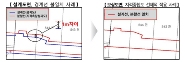 이에 국토부는 가이드라인을 통해 실시설계 단계에서 지적중첩도 작성과 선지정 지적현황측량을 실시토록 했다. 설계도면과 보상도면 간 경계선 차이의 선제적 해소하기 위해서다.