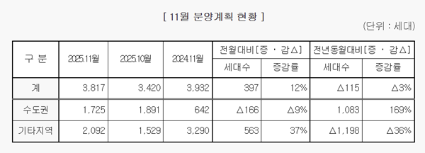 [아유경제_부동산] 중견주택업체, 올해 11월 3817가구 분양… 전년 동월비 3% 감소