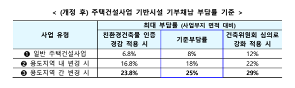 이번 개정안에는 용도지역 간 변경 시 기반시설 기부채납 상한이 도입된다. 주택사업 인ㆍ허가 시 용도지역 내 변경이 이뤄지는 경우 기준부담률(8%)에 17%p를 추가해 사업부지 면적의 최대 25%까지만 기반시설 기부채납을 요구할 수 있도록 하는 규정을 신설한다.