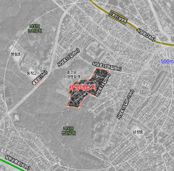 [아유경제=조명의 기자] 서울 동작구 지하철 7호선 남성역 및 사당동 까치산공원 인근 노후 저층 주거지 사당12구역이 재개발을 통해 지상 25층 공동주택 11개동 642가구 규모 주거 단지로 탈바꿈한다.