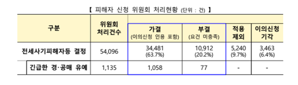 그간 위원회에서 최종 결정한 전세사기 피해자 등은 총 3만4481건(누계), 긴급 경ㆍ공매 유예 협조요청 결정은 총 1058건(누계)이다. 결정된 피해자 등에게는 주거, 금융, 법적 절차 등 총 4만8798건(누계)을 지원하고 있다.