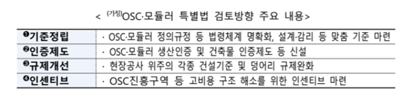 국토부는 특별법 제정을 통해 그간 부족했던 설계ㆍ감리ㆍ품질 관리 등 OSCㆍ모듈러 관련 법적 기준을 정립하고, 각종 불합리한 규제 해소 및 인센티브 지원을 강화할 계획이다.