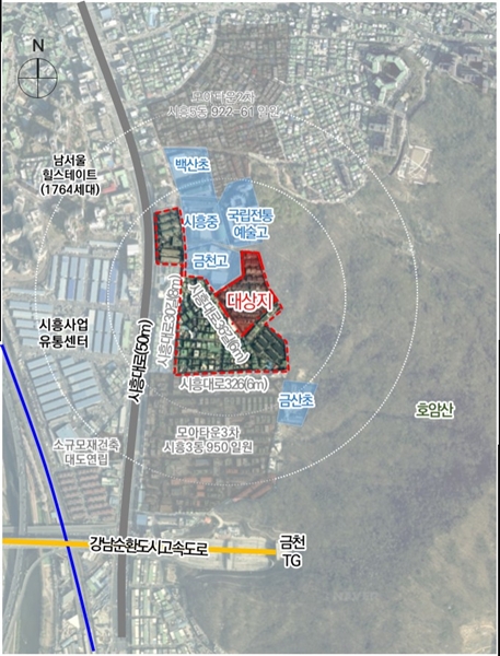 금천구 시흥대로36길 45(시흥동) 일원을 대상으로 한 시흥3동 1005 일대 모아타운사업은 공동주택 7개동 총 473가구(임대 95가구 포함)를 공급하는 내용이다. 전체 가구수 20% 이상 임대주택 건설에 따른 용적률 완화로 사업성을 높였다.