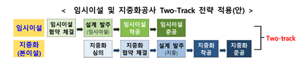 LH는 공기 단축과 주택 공급 조기화를 위해 송전선로 이설 시 `임시이설`과 `본이설`을 병행 추진하는 투-트랙 전략을 도입한다. 기존 송전선로 이설은 협의→설계→시공 등이 순차적으로 진행돼 평균 8년 이상이 소요됐으나, 투-트랙 전략을 도입하면 평균 2~3년의 공기 단축이 가능해진다.