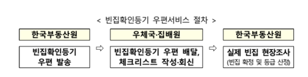 빈집확인등기 우편서비스는 빈집실태조사를 대행하는 한국부동산원이 추정 빈집에 대해 빈집확인등기를 발송하면, 지역 사정을 잘 아는 우체국 집배원이 해당 주택을 방문해 주택 외관, 거주자 유무 등 빈집 확인 체크리스트를 작성해 한국부동산원에 회신하는 방식으로 진행된다.