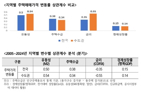 주택산업연구원은 2005년부터 2024년까지 주택 매매가격에 영향을 미치는 요인을 단순상관계수로 비교해 본 결과 유동성(통화량 M2 기준 상관계수ㆍ0.5)이 가장 큰 영향이 미쳤고 다음으로는 주택 수급(0.38)과 금리(-0.35), 경제성장률(0.15) 순으로 나타났다고 밝혔다.