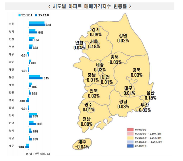 [아유경제=권혜진 기자] 최근 한국부동산원이 발표한 `주간아파트 가격동향`에 따르면 2025년 12월 2주(지난 8일 기준) 전국 아파트값은 상승(0.06%)을 기록했다. 수도권과 서울, 지방 모두 상승했다.