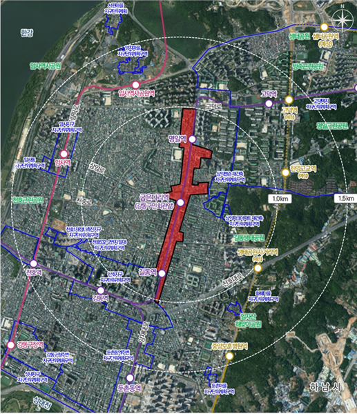 강동구 양재대로 1488(길동) 일원 면적 35만9716.7㎡의 대상지는 강동구의 일상생활 중심 거리이자 남ㆍ북을 연결하는 중심축인 양재대로 일대로, 지하철 5호선인 길동역ㆍ굽은다리역ㆍ명일역을 포함한 역세권 구간이 해당된다. 양재대로변에는 상업ㆍ근린생활시설이 주로 배치되고 이면부에는 저층 주거지가 분포하고 있다.