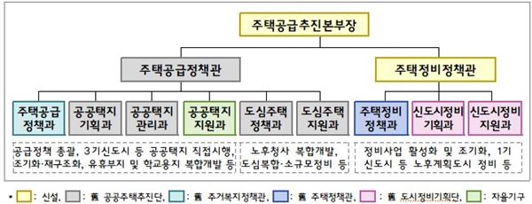 공공 부문 공급을 주도하는 주택공급정책관(6과)과 민간 부문 공급을 관리ㆍ지원하는 주택정비정책관(3과) 등 2정책관 9과 체제로 운영된다.