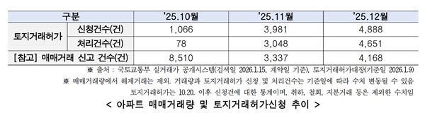 서울 전역 토지거래허가제 시행(지난해 10월 20일) 이후 2025년 12월 말 기준 아파트 토지거래허가 신청은 총 9935건 접수됐으며, 이 중 7777건(78.3%)이 처리됐다. 지난해 10월 20일부터 11월까지 토지거래허가 신청가격은 10월 실거래가격과 비교해 1.49% 상승했으며, 12월 신청분은 전월 신청가격 대비 1.58% 올라 상승 폭이 커졌다.