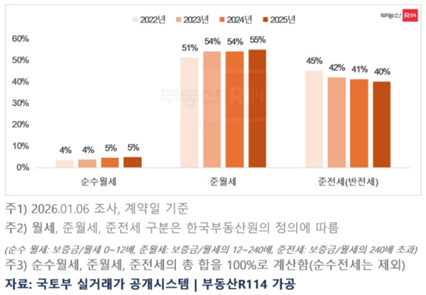최근 부동산R114가 국토교통부 실거래가 자료를 분석한 결과에 따르면 서울 아파트 임대차계약 중 준월세 비중은 2022년 51%, 2023년 54%, 2024년 54%, 지난해에는 55%로 꾸준히 확대됐다.
