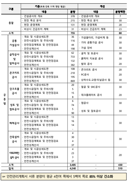 또 계획서 내 중복ㆍ유사 내용, 안전관리계획서와 관련 없는 내용, 단순 법령 제시 등 불필요한 내용을 삭제하고 항목별 최대 분량을 제한해 평균 4000여 쪽에 달하던 계획서를 500여 쪽으로 간소화했다. 현장에서는 최대 80쪽의 본편 위주로 실제 안전 관리에 활용하고, 설계도서 등은 부록으로 분리해 별도 검토 시에만 활용토록 했다.