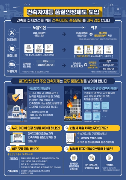 건축자재품질인정제도는 화재 안전성이 중요한 건축자재에 대해 명확한 성능기준을 제시하고 기준에 맞게 제조ㆍ시공하도록 관리하는 제도다. 한국건설기술연구원이 품질인정기관으로 지정돼 내화구조, 방화문, 자동방화셔터, 내화채움구조, 복합자재(샌드위치패널) 등 5개 건축자재에 대한 품질인정서를 발급하고 제조공장ㆍ시공 현장을 점검하고 있다.