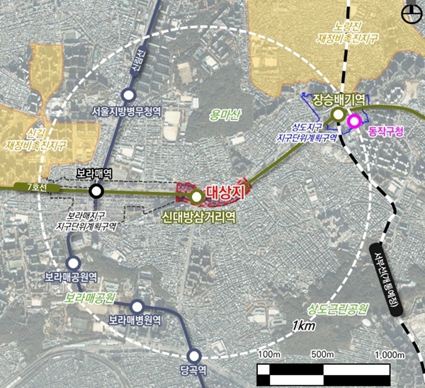 대상지는 동작구 상도로 60(대방동) 일원 5만5941.4㎡ 규모로 지하철 7호선 신대방삼거리역 일대다. 서측으로는 7호선ㆍ신림선 보라매역, 동측으로는 7호선ㆍ서부선(예정) 장승배기역이 있어 광역교통의 중간적 요충지 역할을 하고 있다.