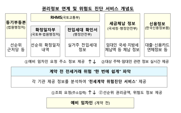 이에 정부는 등기정보, 확정일자, 전입세대, 세금 체납 정보 등 여러 기관에 흩어져 있는 데이터를 연계해 선순위 권리정보를 분석하고 위험도를 진단해 예비 임차인이 계약 전에 확인할 수 있는 체계를 구축한다. 이를 위해 주택도시보증공사(HUG)가 운영 중인 `안심전세 앱`을 고도화해 법적 근거를 마련하기 전에도 오는 9월부터 임대인 동의 방식의 서비스를 개시할 예정이다.