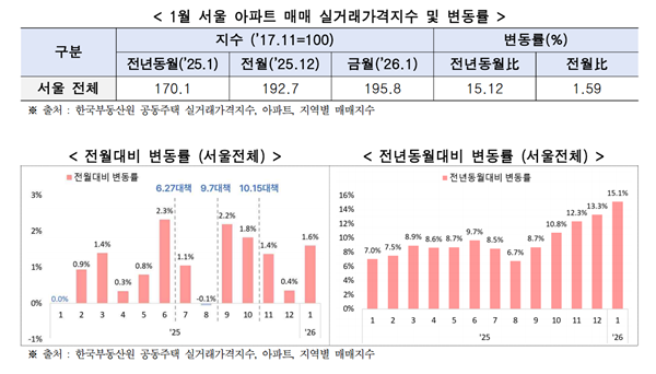 최근 서울시에 따르면 이달 한국부동산원이 공표한 올해 1월 서울 아파트 매매 실거래가격은 전월(2025년 12월) 대비 1.59% 상승했으며, 전년 동월과 비교하면 15.12%의 상승 폭을 기록했다.
