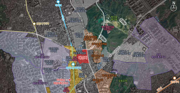 시는 대상지가 역세권이고 주변 개발 등 향후 여건 변화를 고려해 역세권 규제 완화를 적용해 용도지역을 제2종일반주거지역ㆍ제2종(7층 이하)일반주거지역에서 준주거지역ㆍ제3종일반주거지역으로 상향하고 사업성 보정계수(1.8)을 적용했다.