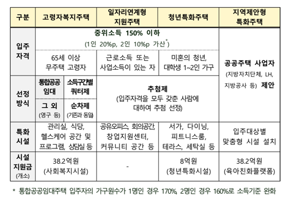 공모사업 유형은 지역제안형 특화주택, 고령자 복지주택, 청년특화주택, 일자리 연계형 지원주택 4가지다.