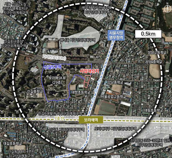 신길5구역은 영등포구 여의대방로35가길 19(신길동) 일원 7만6629.9㎡로 2020년 1월 공동주택(`보라매SK뷰`)이 준공됐으나, 구역 내 나대지 상태로 남아있던 문화시설 부지의 효율적 활용을 위해 계획 변경이 추진됐다.
