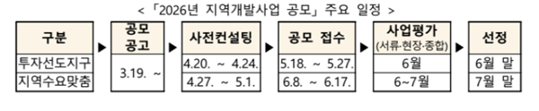 공모에 관한 상세 내용은 `지역개발정보시스템`에서 확인할 수 있다. 이달 27일 지자체 설명회를 시작으로 사전컨설팅, 서면ㆍ현장 심사, 종합평가 등을 거쳐 투자선도지구는 올해 6월 말, 지역수요맞춤지원사업은 7월 말에 각각 대상지가 선정될 예정이다.