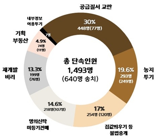 유형별 단속 인원은 ▲공급 질서 교란(448명)이 전체의 30%로 가장 많았고, ▲농지 투기(293명) ▲집값 띄우기 등 불법 중개 행위(254명) ▲명의신탁(218명) ▲재개발 비리(199명) 등이 뒤를 이었다.