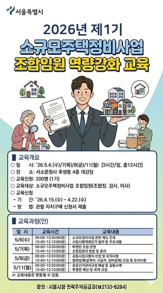 상반기 교육 이수를 희망하는 조합 임원은 이달 15일부터 22일까지 관할 자치구를 통해 신청할 수 있다. 교육 일정ㆍ장소, 교육내용, 이수 기준 등 세부 내용은 `정비사업 정보몽땅`에서 확인할 수 있다.