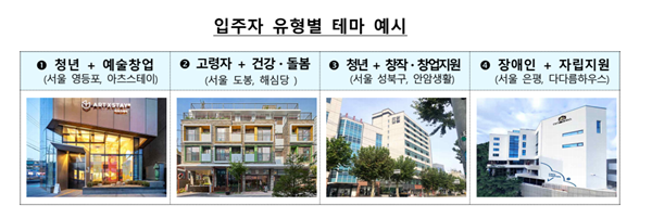 서울 내에서 고령자 커뮤니티 형성과 건강ㆍ돌봄 서비스를 제공하는 `해심당(도봉구)`, 청년의 예술ㆍ창업을 지원하는 `아츠스테이(영등포)`, 장애인 자립을 돕는 `다다름하우스(은평구)` 등이 대표적이다.