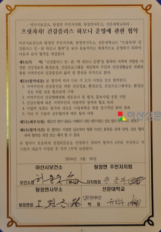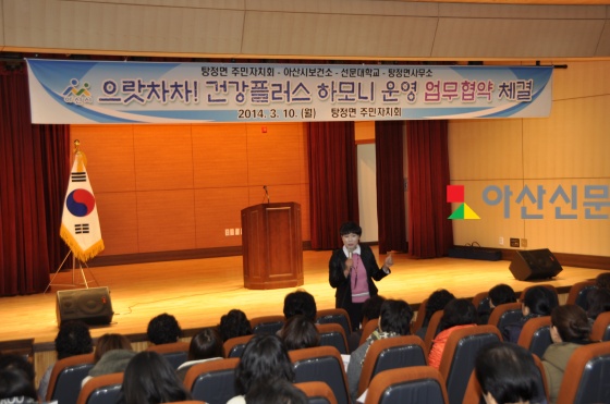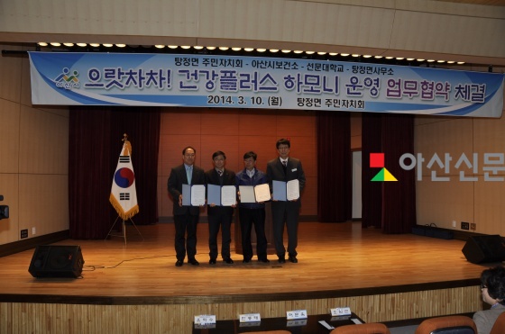 3월 10일 오전 10시 30분 탕정면사무소 3층 대강당에서 한종태 탕정면 주민자치회장과 허문욱 아산시 보건소장, 그리고 유학수 선문대학교 입학처장, 오원근 탕정면장등이 “으랏차차! 건강플러스 민․관 하모니 협력”을 보다 효율적이고 체계적으로 운영하기로 협약서에 서명했다.