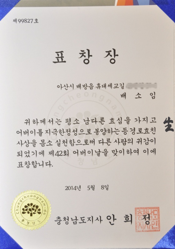 중증 노환을 앓고 있는 시어머니를 극진히 모시고 있어 지역사회의 칭송이 자자하며 타의 모범이 된 휴대리 배소임씨가 도지사 표창을 받았다.