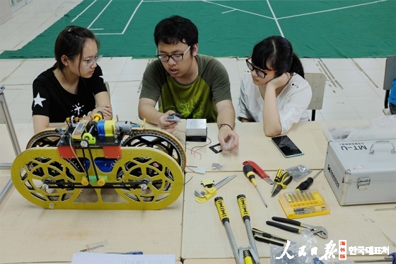 사진은 몇 명의 대학생들이 대중 창업공간에서 로봇혁신 프로젝트를 토론하고 있는 모습. /신화사 류샤오징 기자 5月14日,东华大学众创空间正式挂牌成立,这是上海首个高校众创空间。东华大学众创空间将分期建设,目前的一期建设以东华大学工程训练中心、实验室等为载体,为学生提供3D打印机、数控机床、智能切割机等实体工具及各种网络资源,帮助大学生将奇思妙想转化为现实产品,为他们创新创业提供平台。图为几名大学生在众创空间讨论创新机器人项目。