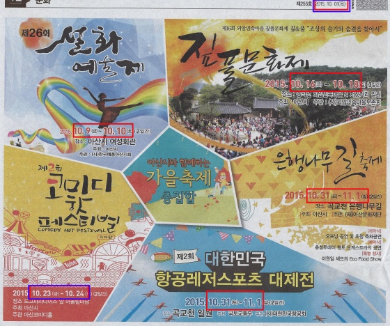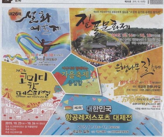 아산시가 발행하는 아산뉴스 제255호(2015년 10월) 12면에 ‘아산시와 함께하는 가을 축제 총집합’이 실렸다.