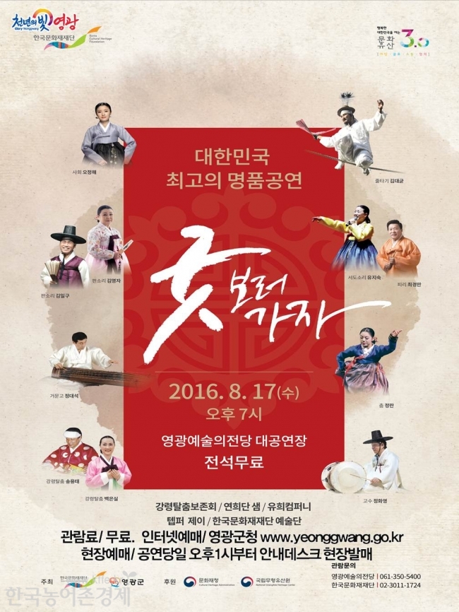 무형문화유산의 오늘과 내일을 한 무대에서 펼치는 『굿GOOD보러가자』공연은 한국문화재재단, 영광군에서 공동 주관하며 문화재청과 국립무형유산원에서 후원한다. 관람료는 전석무료이며 입장권은 티켓링크를 통해 8월 16까지 예매가능하며 공연당일인 8월17일 오후1시부터는 현장예매를 실시한다.