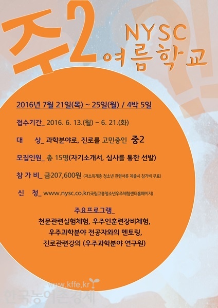 국립고흥청소년우주체험센터(원장 이상각, 아래 우주체험센터)는 오는 13일부터 우주과학분야 진로 희망하는 중학교 2학년생을 대상으로 ‘2016년 NYSC 여름학교(아래 여름학교)’ 참가 신청을 받는다.