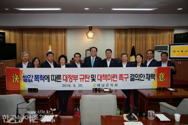 이에 해남군의회는「쌀값 폭락에 따른 대정부 규탄 및 대책마련 촉구결의안」을 채택하여 연속되는 풍작과 쌀 소비량 감소에 따라 쌀 값이 하락하고 있는 가운데 쌀값 폭락에 대한 대책으로 밥쌀용 쌀 수입 중단, 수확기 전 정부의 수매계획 조기발표, 재고미 소진 종합대책 마련, 변동형 직불제 축소 움직임 중단, 쌀 생산 유통지원 확대 등을 조속히 시행할 것을 촉구하였다.