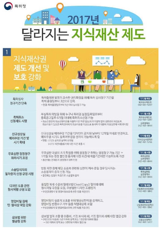특허청(청장 최동규)은 지재권 제도 개선, 출원인 편의증진 등을 골자로 하는 ‘2017년 새롭게 달라지는 지식재산 제도․지원시책’을 3일 발표했다.